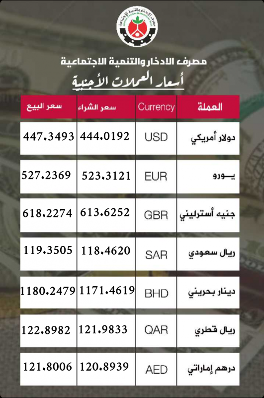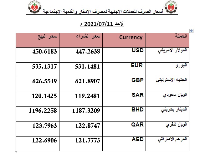 أسعار الصرف للعملات الاجنبية لمصرف الادخار والتنمية الاجتماعية الاربعاء 14/07/2021 م العملة Currency سعر الشراء سعر البيع الدولار الامريكي USD 444.0192 447.3493 اليورو EUR 523.3121 527.2369 الين ياباني JPY 4.0183 4.0484 الجنيه الاسترليني GBP 613.6252 618.2274 الفرنك سويسري CHF 483.6126 487.2397 الدولار الكندي CAD 355.0393 357.7021 الريال سعودي SAR 118.4620 119.3505 الدينار بحريني BHD […]