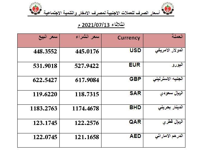 أسعار الصرف للعملات الاجنبية لمصرف الادخار والتنمية الاجتماعية الثلاثاء 13/07/2021 م العملة Currency سعر الشراء سعر البيع الدولار الامريكي USD 445.0176 448.3552 اليورو EUR 527.9422 531.9018 الين ياباني JPY 4.0299 4.0601 الجنيه الاسترليني GBP 617.9084 622.5427 الفرنك سويسري CHF 486.3899 490.0378 الدولار الكندي CAD 357.1770 359.8558 الريال سعودي SAR 118.7315 119.6220 الدينار بحريني BHD […]