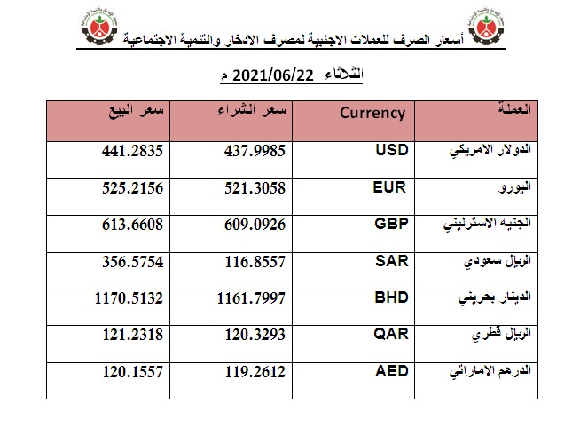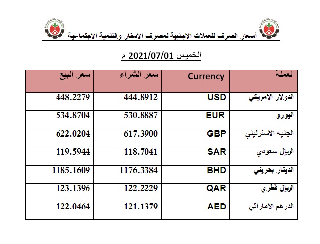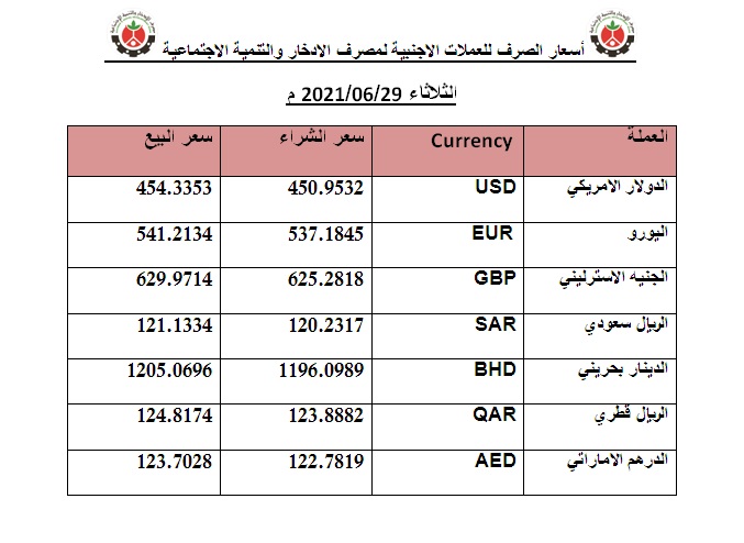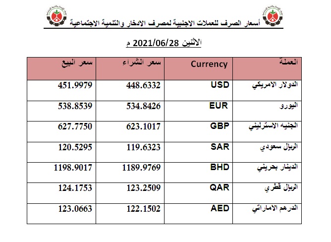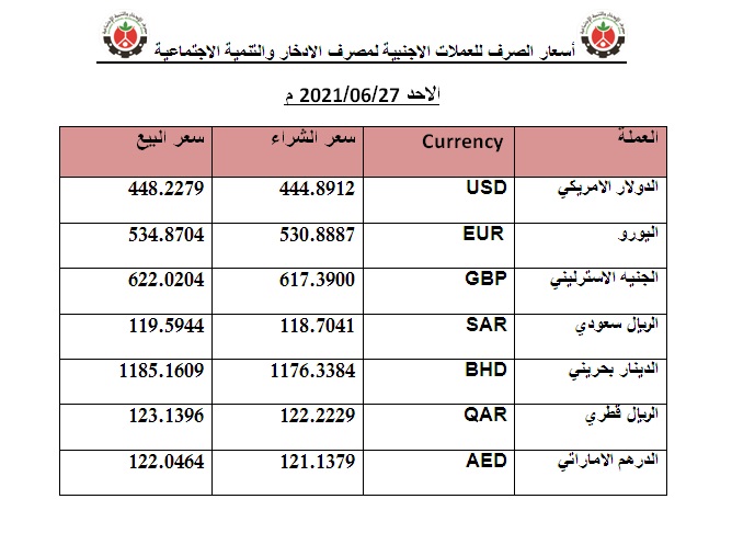 أسعار صرف العملات الاجنبية من مصرف الادخار والتنمية الاجتماعية